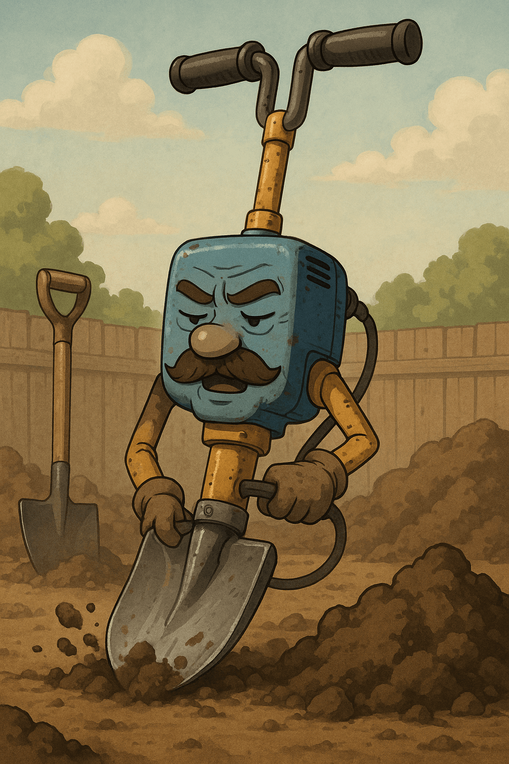 日の出とともに、現場に響くモーター音。今日もオレの出番だ。電動スコップのエルドだ。巷じゃあ俺のことを敬意をこめて「エルド・ザ・電動スコップ」と呼んでいる。悪くない。バッテリー満タン、スイッチひとつで地面を切り裂く。オレの使命はただひとつ――掘ること。それがオレの生きる理由だ。